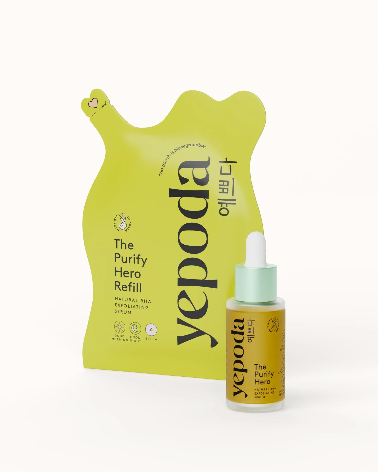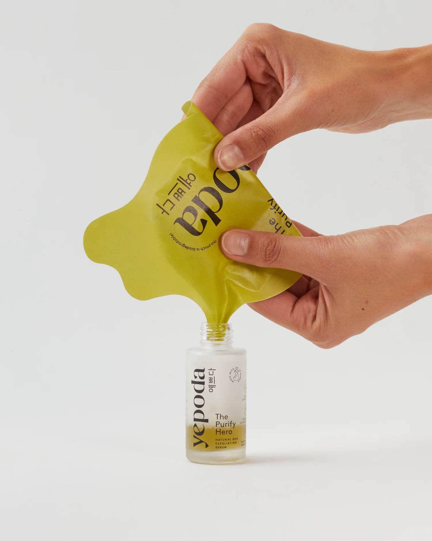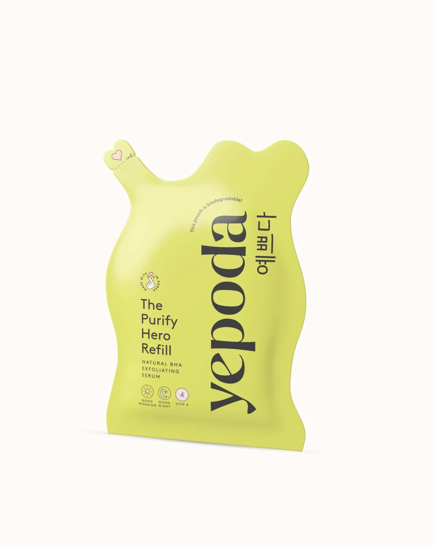 Cette recharge sous forme de poche biodégradable vous permet de recharger et réutiliser facilement votre flacon de taille originale The Purify Hero encore et encore; pour une routine de soin plus éco-responsable. Grâce à la présence d'extrait d'écorce de saule, une forme naturelle de BHA, ce sérum exfolie la peau en douceur, désobstrue les pores et stimule le renouvellement cellulaire. Votre allié pour un teint unifié, sans imperfection !